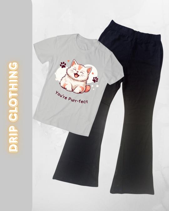 Drip Clothing – “You’re Purr-fect” Tee & Black Flared Trousers Set Make your casual days extra cute with this adorable and comfy outfit from Drip Clothing! This set includes: Graphic Tee: Light grey t-shirt featuring a super cute kitten print with the phrase “You’re Purr-fect”. Made from soft, breathable fabric – perfect for everyday wear.